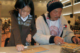 エコセンでは、エコツアーの魅力を紹介するパネル展示やパンフレットの配布を行うとともに、木の枝を自分で削ってつくる“マイ箸”づくりに挑戦してもらいました。